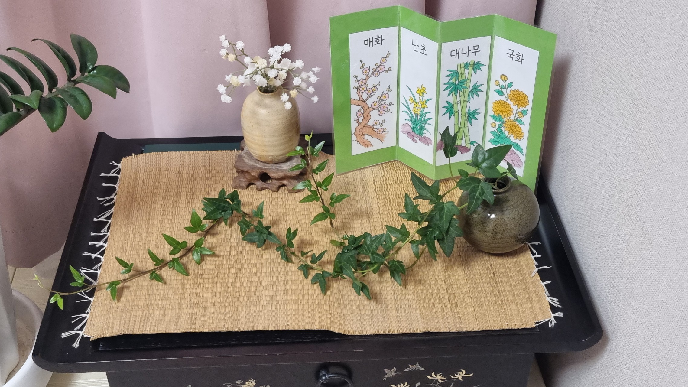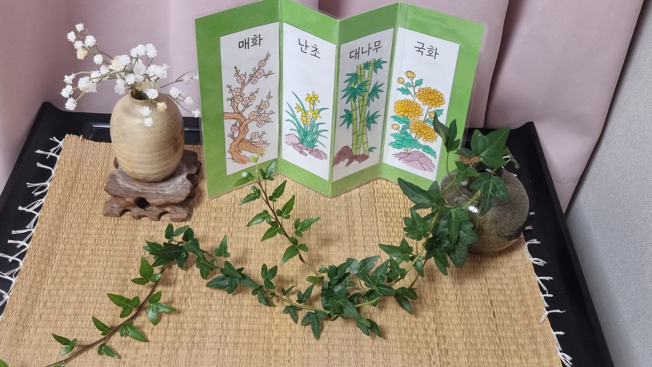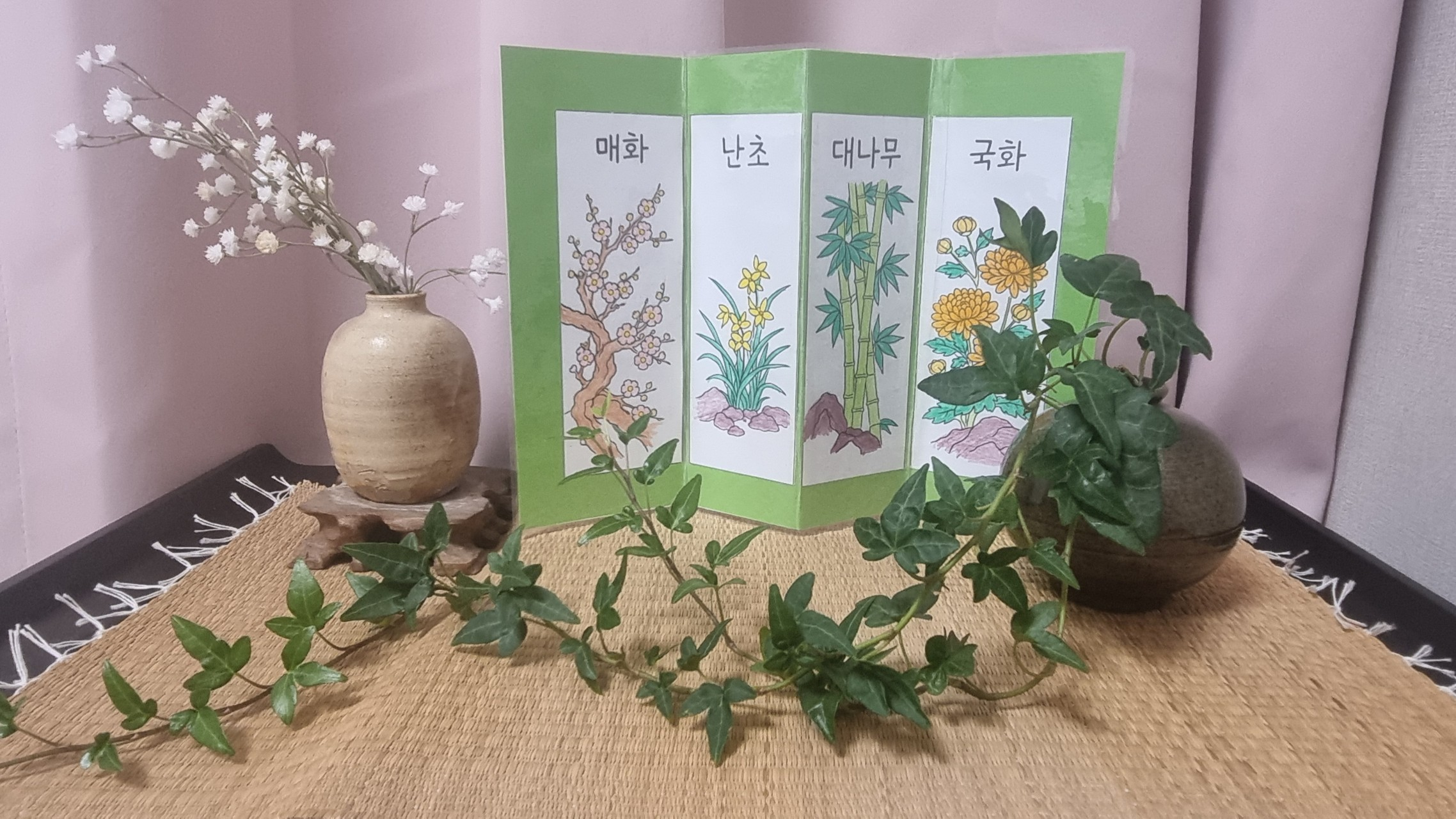 완성된 병풍은 정말 놀라웠습니다. 깔끔하면서도 섬세한 색의 조화, 그리고 그 안에 담긴 어르신의 마음까지 느껴졌습니다. 제가 “정말 예쁘게 잘하셨어요!” 하고 칭찬을 드리자, 어르신께서는 빙그레 웃으시며 “예쁘면 가져가.” 하시며 그림을 선물로 건네주셨습니다.
